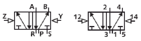 O número de portas é mostrado pelo número de pontos finais em uma determinada caixa. Conte apenas as portas em uma caixa de fluxo por símbolo (as outras caixas mostram apenas estados diferentes da mesma válvula).