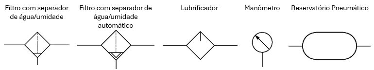 Logo abaixo temos alguns equipamentos pneumáticos representados de forma generalizada , não se preocupem, pois estaremos aprofundando mais itens que necessitam de maior atenção como válvulas e cilindros, posteriormente.